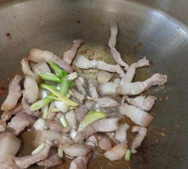 第5步、下姜丝和蒜段,翻炒出香味。