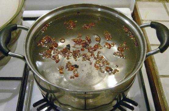 第二步:锅内倒入适量的油下入准备好的香料和辣椒翻炒,出香倒入适量的清水烧开后转小火熬制5分钟。