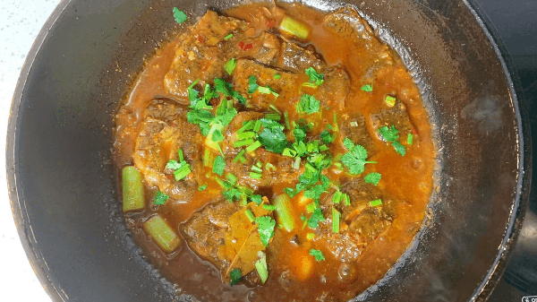 3、锅中所有调味品加入以后,再倒入没过鱼段的清水,中火炖20分钟,最后再开大火收汁关火。再准备一棵香菜去掉根部,清洗干净后切碎撒上,把它盛出来即可。