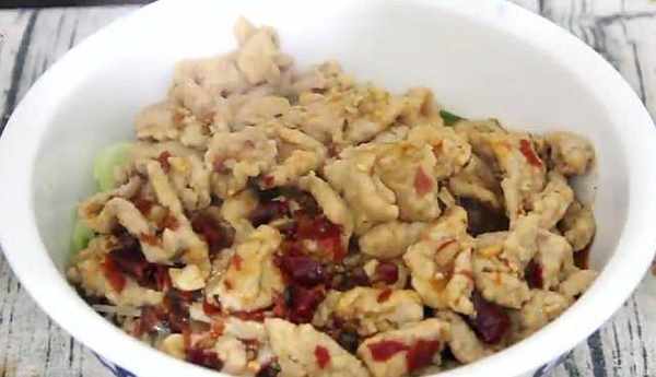 用筷子继续给它搅拌均匀,最后淋入少许的食用油加食用油,可以防止肉片粘连,然后腌制10分钟左右。放入少量的油,下入葱、姜、蒜、花椒、干辣椒。炒一下。炒香以后加入。配菜翻炒一下。油热下入葱、姜、蒜、花椒、干辣椒炒一下。炒香以后加入两勺豆瓣酱。然后加入适量的清水,加一勺盐。
