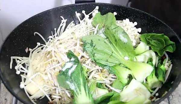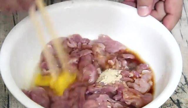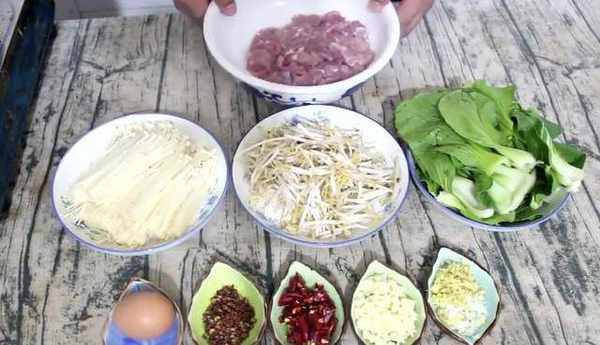 我们需要准备的主要材料有少许的葱末、姜末和适量多的蒜末、干辣椒段、花椒,一个鸡蛋,洗干净的油菜,绿豆芽,洗干净的金针菇,切好的里脊片。首先我们把肉片连一下,加一勺的盐,一勺的胡椒粉。少许的料酒,少许的生抽,打入一个鸡蛋。用筷子给它搅拌一下,搅拌均匀,然后加入一勺的干淀粉。