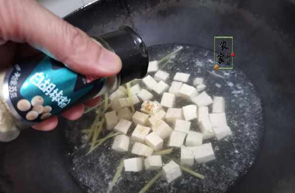 5、因为我喜欢吃嫩豆腐,所以熬煮的时间不久,盖上锅盖将锅内的水煮开后,就可以根据自己和家人口味的喜好往锅里加入一些胡椒粉,加入胡椒粉可以使得煮好的汤汁味道更加富有层次感。