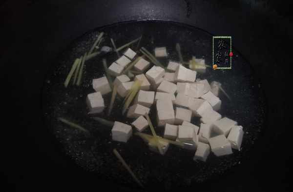 4、接着就把准备好的豆腐也一块放到锅内,豆腐属于比较耐煮的食材,因此我们可以提前下锅。要是喜欢吃煮得老点的豆腐甚至可以将豆腐在锅内熬煮片刻。