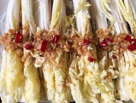 步骤3、加入蒜泥、剁椒酱,小火煎至呈金黄色,此时即可熄火,在娃娃菜上铺上油炸蒜蓉酱,同时加少许味极鲜美的蚝油;