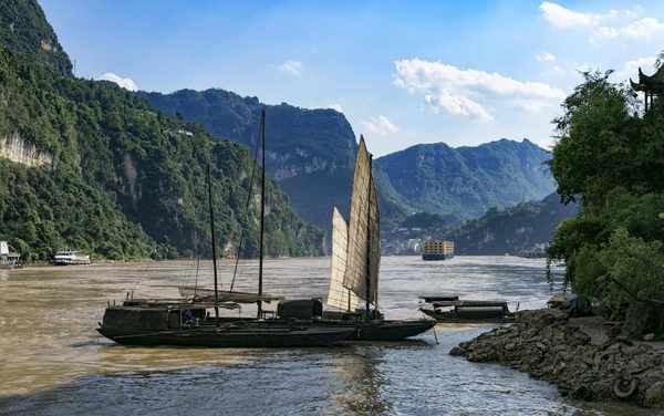 三峡人家,依山傍水,风情如画:点缀于山水之的三峡吊脚楼,久违的古帆船,溪边挥着棒槌清洗衣服的少女,江面上悠然撒网打鱼的渔家……