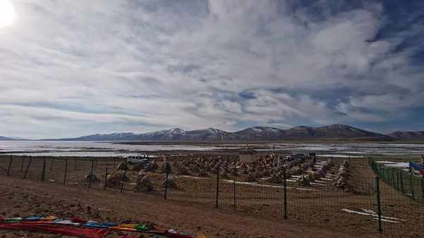 从尼玛县城向南出发,快到那个著名的网红景点“一路穿两湖”的地方之前,转向西南申亚乡方向。在到达申亚乡之前,路边就可以望见孜桂错。下公路,走草原上的自然路来到湖边。我们发现湖边有一片铁丝网围成方形,中间是排列整齐的小玛尼堆阵列。横向数是11排,纵向是11列,中间有一个较大的佛塔,最北边还有单独的6个小玛尼堆。为什么在这里排列这么多的小玛尼堆呢?