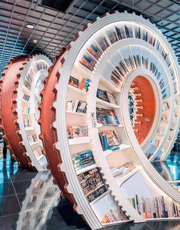 书店大门就令人眼前一亮,一个摆满书的螺旋阶梯从店内延伸到店外,3D立体感十足,在感慨其创意设计之余,也不禁发自灵魂的问一句:这个大门晚上怎么关?