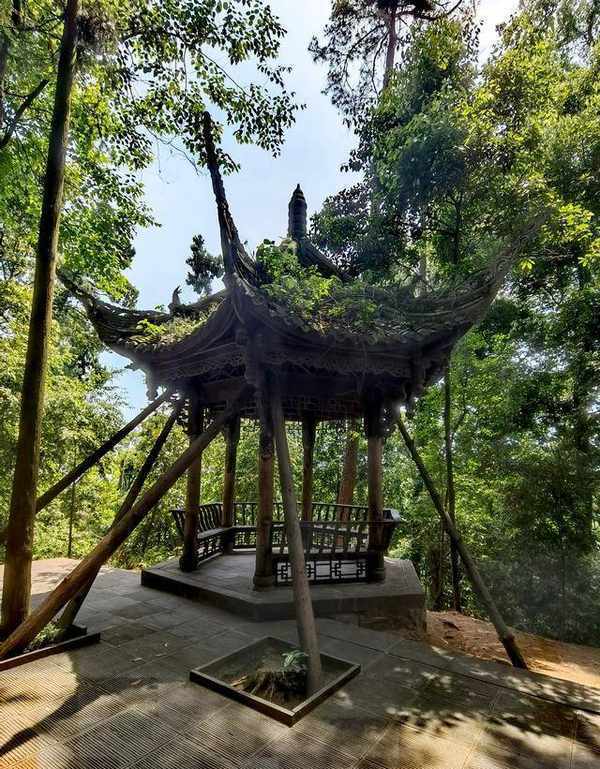 平台上建有一亭台楼阁,本是供游人休息之用,但建筑遭遇自然灾害,景区用些木头将其支撑,看着还是危险,还不如拆除重建得好。