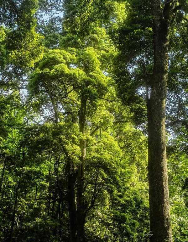 继续前行来到步道与景区专用公路的交汇点,这里森林植被更甚,高耸入云的桢楠树叶翠绿,在光影的作用下明、暗鲜明,层次感清晰,一幅美轮美奂的画卷就在这山林间铺满开来,令人陶醉。