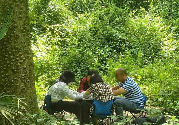 突然前面一个景致让我吃惊不小:一棵高大的树荫下围坐了四人,手不停、嘴不停在打麻将,手搓的,一局刚完嘻笑声一片,洗牌声又响起。