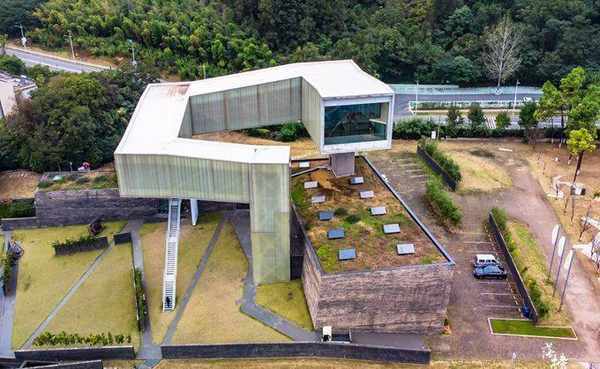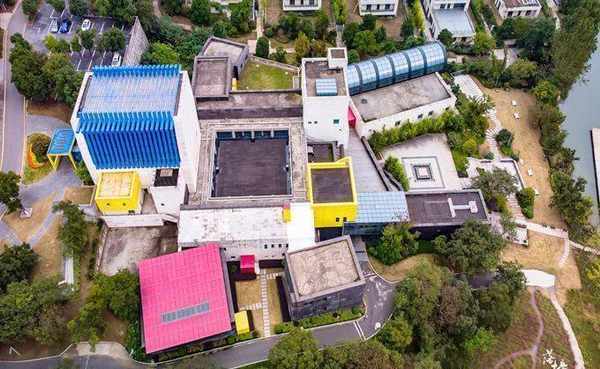 面积很大,周围散落着二十多座形状完全不同的建筑。这些建筑来自不同的建筑师。一层层往下走,犹如参观一场百家争鸣的精彩建筑展览。