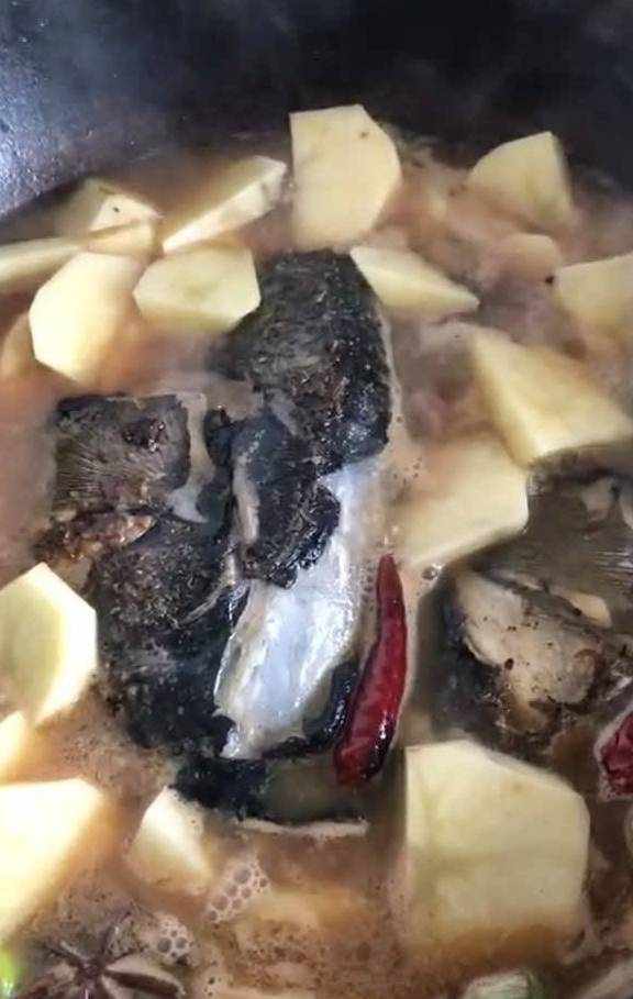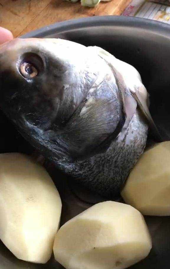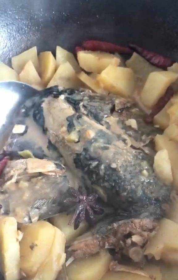 食材配料:鲢鱼头1个(富含胶原蛋白)、土豆2粒、葱、姜、八角、干辣椒、料酒、酱油、大酱、米醋、盐、鸡精、白糖。