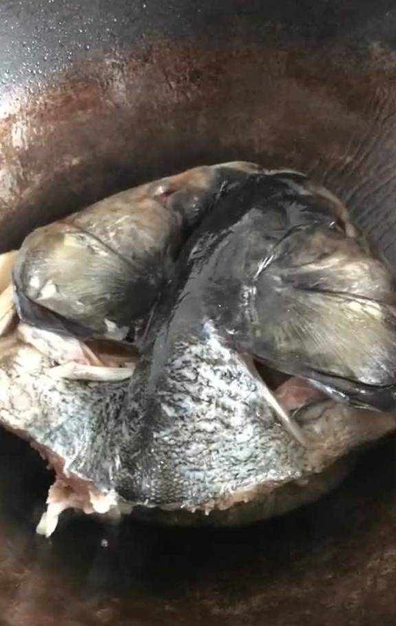 鱼头劈成两半,不要切断,让两边微微连着点,带肉的部位朝下,油烧4成热下锅,开中火慢慢煎成焦黄色,略微烧焦点都没关系。