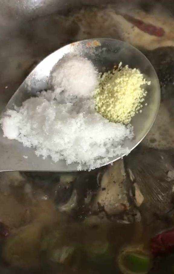 调料就选择三样,盐、鸡精、白糖就够了,放上味精就“画蛇添足”了,我们要的是鱼头的天然的味道。