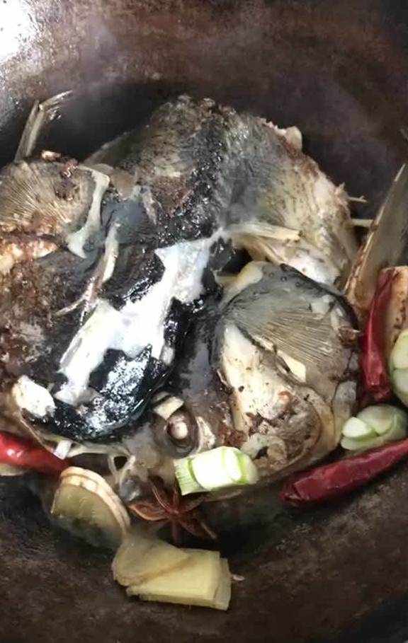 然后加入葱、姜、大料(八角)、干辣椒,四样全都是辛辣的香料,专门用来去除鱼头的腥味。