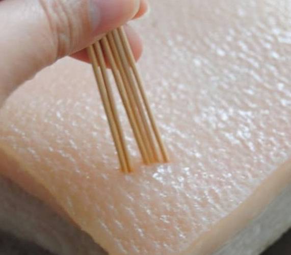 捞出,猪皮面朝上,用牙签密密麻麻的扎孔,深度以过猪皮些为准,扎得密一些后期松皮效果会更好