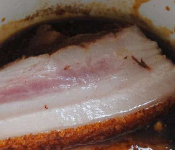 煮好的肉,因为高压锅煮十分钟,大概是五六分熟,筷子扎下去扎不透就行,此时猪肉的皮是软的