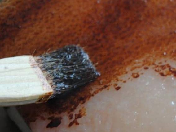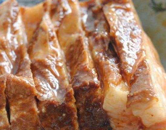用刷子细细的刷在扎好孔的猪皮上,整块猪肉都刷上老抽醋,再翻猪皮面朝上晾稍干表面。