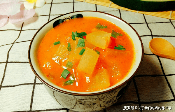1、西红柿洗干净后去皮,切成小丁。冬瓜去皮去瓤,洗干净后切掉块,香葱剥洗干净后切葱花。锅里倒入适量油烧热,放入葱花爆香,倒入番茄丁,小火煸炒出西红柿汁。