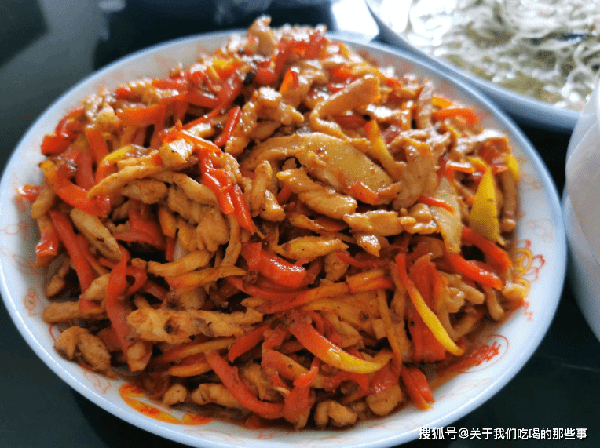2、鸡丝加入适量食盐、生抽、料酒、蚝油、胡椒粉、淀粉、食用油抓拌均匀,腌制10分钟。起锅烧油,倒入腌好的肉丝,小火滑炒至变色,盛出备用。