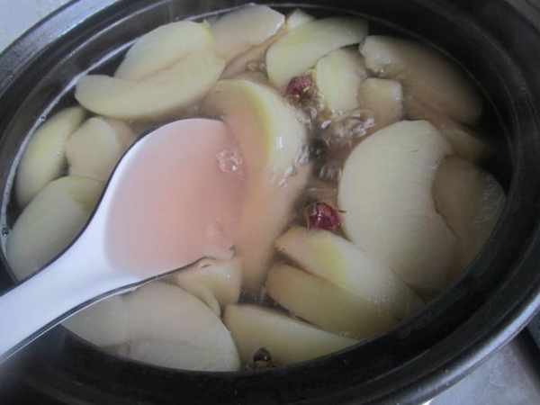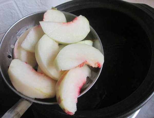 砂鍋裏放入清水,把處理好的桃子肉放入,大火燒開。