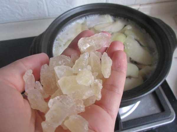 然後加入適量的老冰糖,老冰糖也就是我們常說的黃冰糖,它可以補中益氣,和胃潤肺,止咳化痰,是秋冬很不錯的一種食材。當然如果老年人吃則建議少放糖或者不放糖。