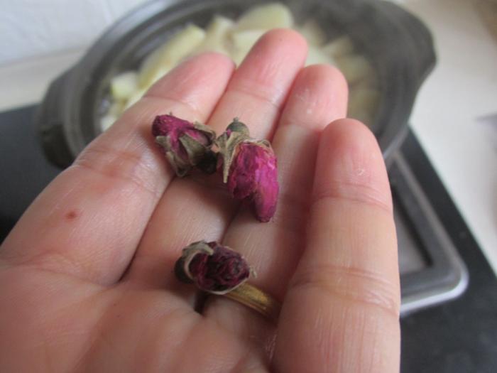再放上3朵玫瑰一起煮,改成小火慢慢的燉上15分鐘。