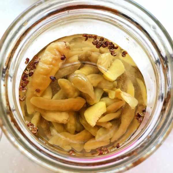 所用資料:長豆角,泡野山椒,花椒,薑片,鹽,白酒。
