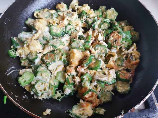 第五步:秋葵熟透了,倒入蛋液煎炒。