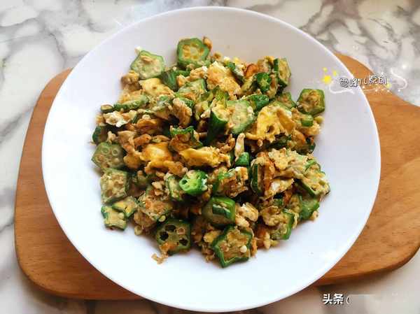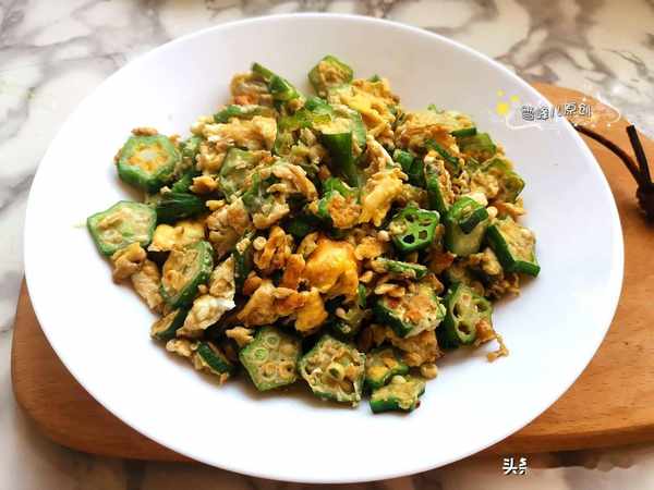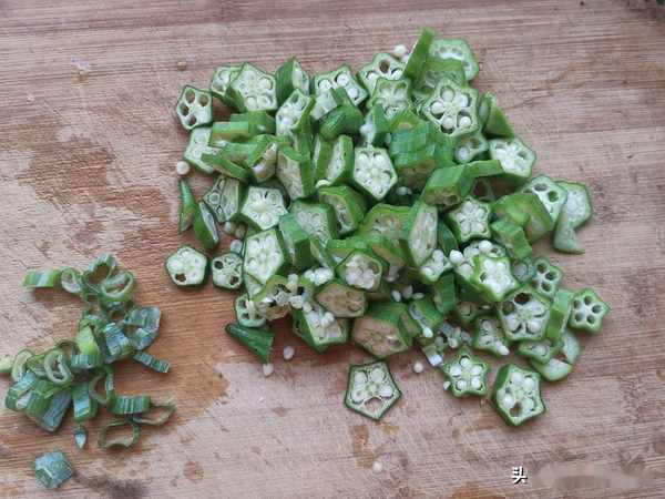 資料:黃秋葵適量,葱末少許,鹽少許,雞蛋3個,花生油適量。