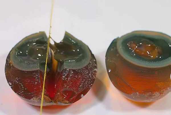 1、松花皮蛋去壳切开,如何将刚买来的皮蛋切开呢?告诉大家一个小方法,可以用一根细棉线将皮蛋划开。或者你也可以放到冰箱里冷藏一小时左右,再拿出来用刀切,用刀切的时候就不会沾到皮蛋的蛋黄了。
