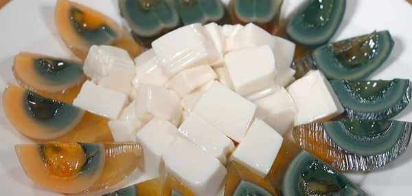 2、然后再将嫩豆腐切成小块状,将它和皮蛋一起放在盘中摆好。