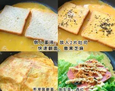 (1)平底锅刷油预热倒入蛋液,放入两片吐司翻面,再撒上黑芝麻
