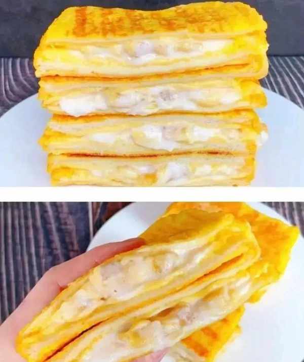 (2)吐司片铺上一层芝士片和香蕉酸奶,在铺上一层芝士片,将其四面沾满蛋液