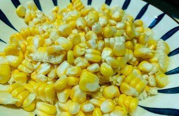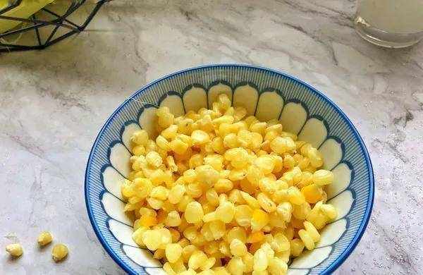 2.水烧开后,放入三克碱面。然后转中火煮沸15分钟。15分钟后捞出控水。用刚买来的菜刀把玉米粒切下来。放在一个大盘子中。