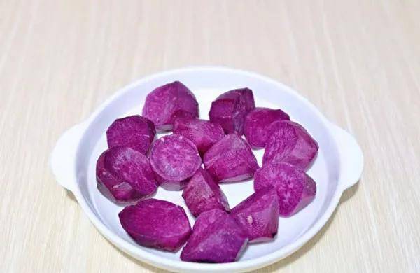 1.首先准备新鲜的紫薯两个,放在清水中洗净。给它切成厚的薄片放入盘中。蒸锅内加入适量的冷水,把准备好的紫薯冷水上锅蒸15分钟。蒸熟之后将其盛出备用。