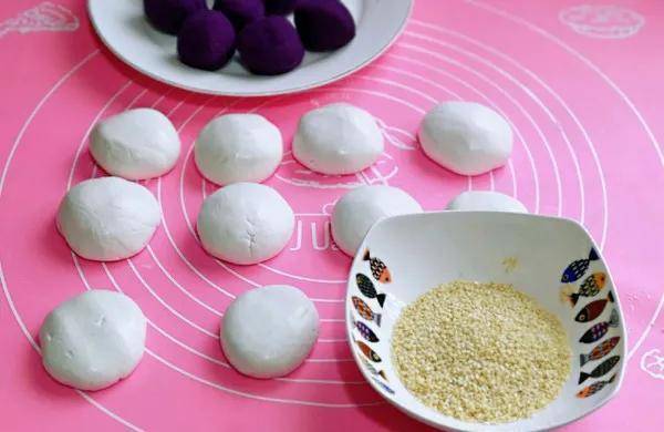 3.糯米粉100克,面粉50克倒入碗中。然后在里面加入少许的清水,用手揉成光滑的面团。不用醒发面团,分成大小均匀的剂子。每一个剂子都擀成圆薄饼状,把紫薯球包裹起来。用手稍微按扁。