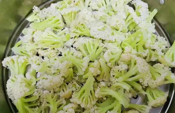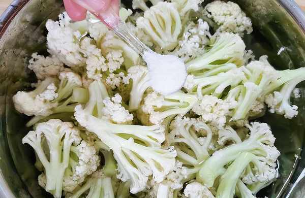 然后看叶子。如果说叶子是墨绿色的,咱们可以买一个回家清洗,特别关键。先把菜花一朵一朵地给它买下来,放在水盆里头加盐泡个10来分钟,为啥呢?因为菜花缝隙比较多,里面有小虫子,经过10分钟的浸泡,盐水有渗透压,小虫子就落在水里头了,这时候你再清洗,然后把灰尘和小虫子清洗掉,那就干干净净的,至于泡多长时间,刚才讲了盐水浸泡10分钟的时间,泡完了之后,咱们把这个菜花一一颗麻摆在一个二大碗里头,然后上面扣一个盘子,给压得实诚一点,大蒸锅烧出水,然后把扣菜花放进去,开始蒸,冒气开始计时。