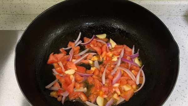 4、继续加入适量的食用油,油热后先把大蒜爆香,然后放入切好的番茄丁和洋葱丝继续翻炒,炒至番茄出汤汁即可,这样番茄味更浓郁。