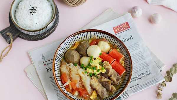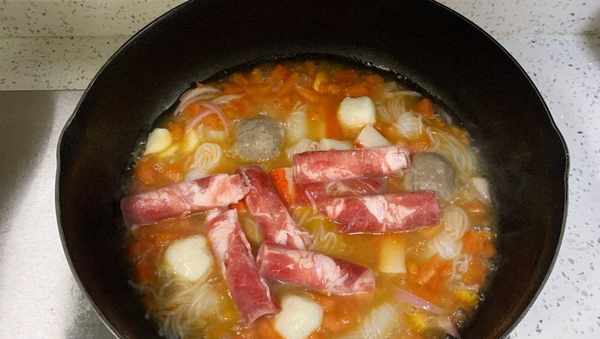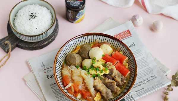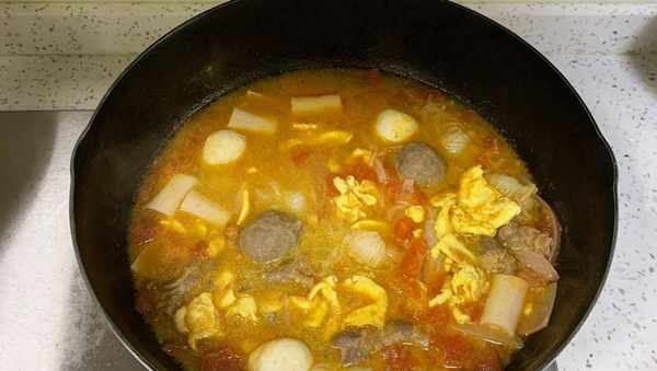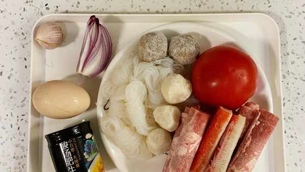 【烹饪食材】:肥牛100克、魔芋丝10个、牛肉丸2个、鱼丸3个、蟹柳或者蟹棒3个、番茄1个、鸡蛋1个、洋葱1/4个、独蒜1个、食用油2勺、酸汤肥牛调味料40克。