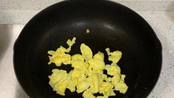 3、锅中加入适量食用油,先将鸡蛋炒熟后盛出备用。