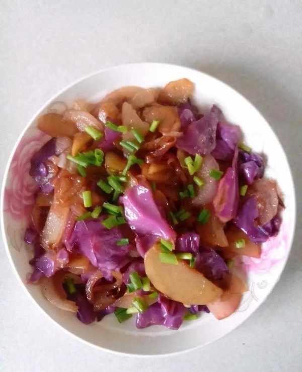 食材:紫甘蓝、土豆、桃园建民西瓜酱、葱姜、酱油、盐