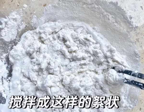 02|加入少许热水搅拌,搅拌成絮状(水量根据糯米粉量加入搅拌成絮状即可)。