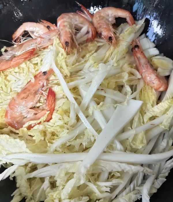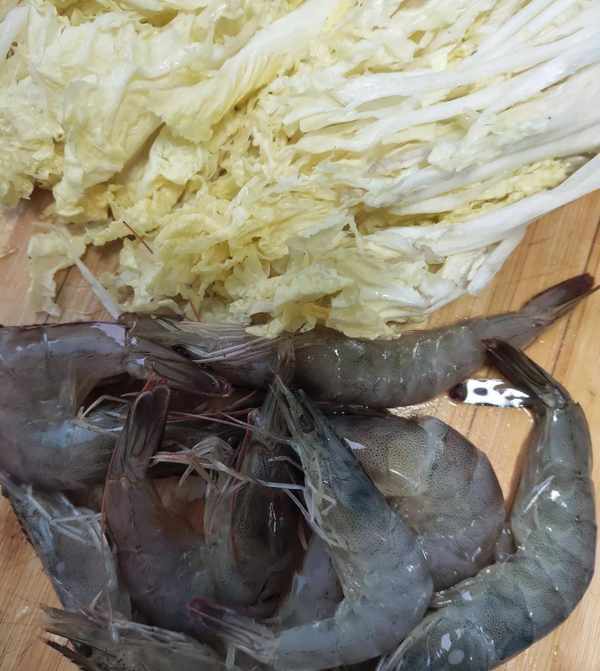 1、娃娃菜洗净切丝,大虾去须、虾线!