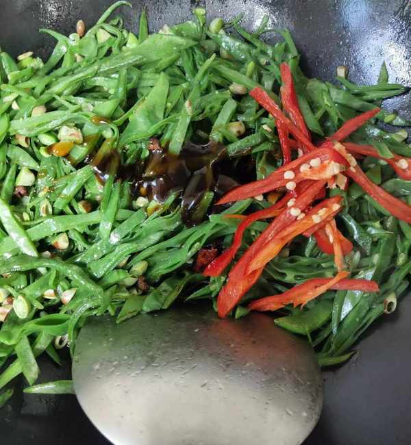 3、扁豆丝变色后,盐、蚝油、生抽少许调味即可出锅装盘!