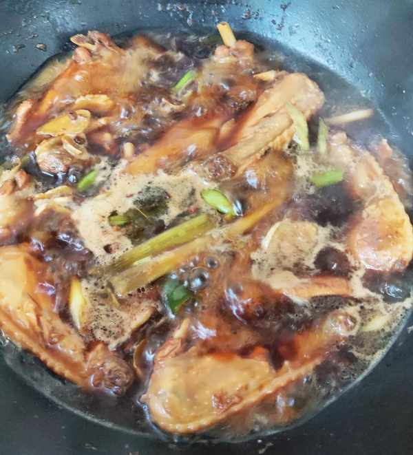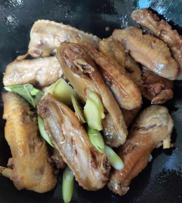 4、烹饪,锅中放油,放入翅中两面煎至微黄,放入葱姜炒出香味后,加入可乐,倒入腌翅中的汤汁,放八角1个,香叶1片,花椒十几粒大火烧开中小火炖15分钟!