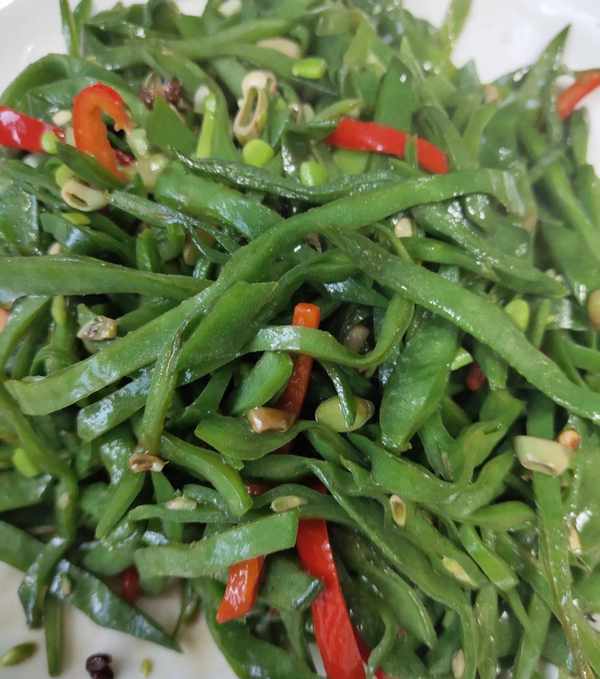 2、锅中放油,蒜片干辣椒爆锅,放花椒十几粒,放入扁豆丝大火翻炒!