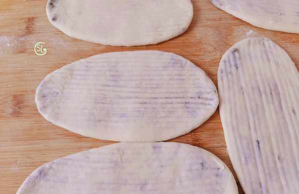 第5步,拿出一个小面剂放在手心里按扁,或者是用擀面杖擀开,放上豆沙馅,然后再像包包子一样包起来,按压一下,放在案板上擀开,擀成牛舌状,接着我们用叉子在上面整理出花型。也可以省略了这一步。制作好的一个先放在一旁,盖上保鲜膜接着做,下一个。