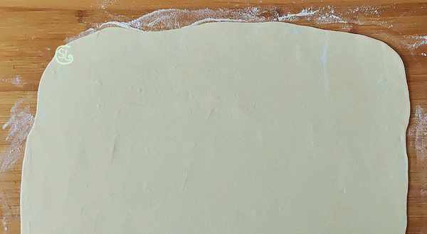 第3步,面团儿揉至光滑之后不用发面,直接放在案板上擀成一个长方形的面饼,在上面抹上调好的油酥,涂抹均匀。