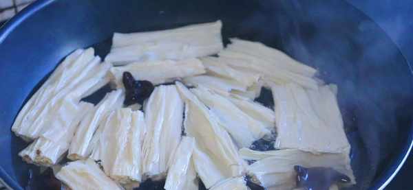 步骤①:首先我们来处理腐竹,把腐竹掰成小段放到大盆里,加入不烫手的温水,再加入一勺盐搅拌化开,然后用一个盘子压在上面,让腐竹都泡在水里15分钟,15分钟后捞出来可以看到,这样泡的腐竹不烂也没有硬芯。